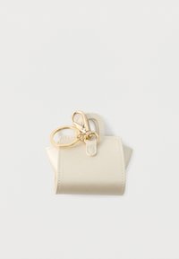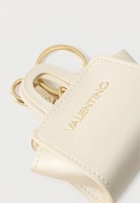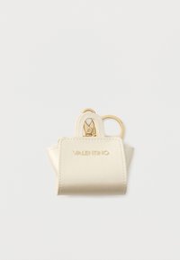 Μικρό μπεζ μίνι τσαντάκι Valentino σε σχήμα μπρελόκ με εξαρτήματα σε χρυσό χρώμα και λογότυπο στο μπροστινό μέρος.
