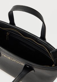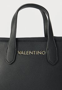 Μαύρη τσάντα χειρός Valentino με χρυσό λογότυπο, δύο κοντές λαβές και αποσπώμενο ιμάντα ώμου με χρυσά καρφιά.