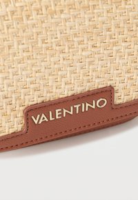 Μικρή μπεζ υφασμένη τσάντα Valentino με καφέ δερμάτινη διακόσμηση και αποσπώμενο ιμάντα ώμου σε απλό φόντο.