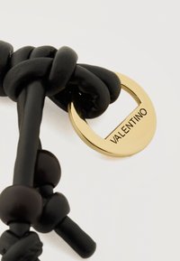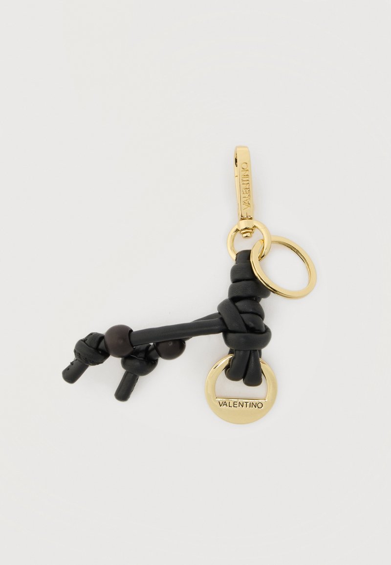 Μαύρο δερμάτινο μπρελόκ με κόμπους και χρυσούς κρίκους, ο ένας χαραγμένος με τη λέξη «Valentino», σε απλό ανοιχτό φόντο.