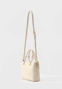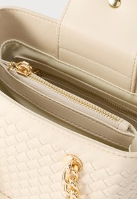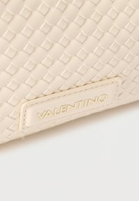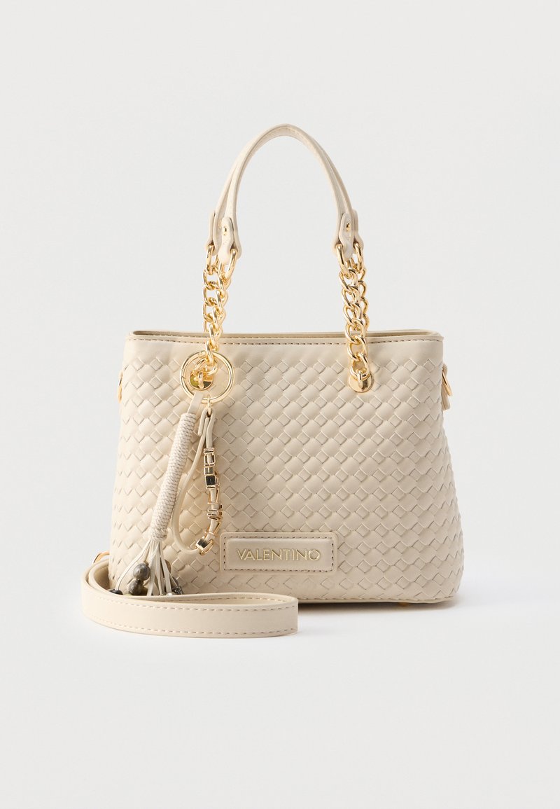 Μικρή υφαντή τσάντα ώμου σε μπεζ χρώμα με χρυσές αλυσίδες ως χερούλια, διακοσμητικό φούντα και πλακέτα με το λογότυπο της Valentino στη μπροστινή πλευρά.