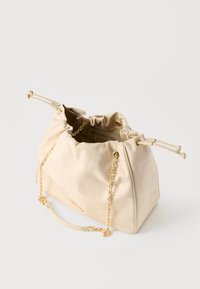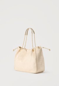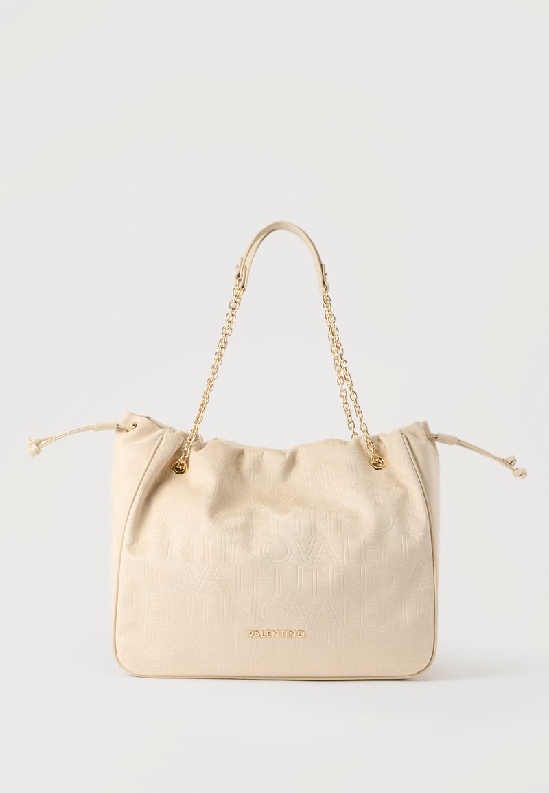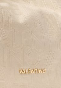 Μπεζ τσάντα χεριού Valentino με ανάγλυφο μοτίβο λογότυπου, διπλό λουρί με χρυσή αλυσίδα, πλευρές με κορδόνι και χρυσή πλακέτα με το όνομα Valentino στο μπροστινό μέρος.