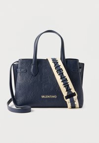 Μαύρη δερμάτινη τσάντα χειρός με ανάγλυφο σχέδιο λογότυπου, διπλές επάνω λαβές και αποσπώμενος ριγωτός ιμάντας ώμου. Χρυσές μεταλλικές λεπτομέρειες.