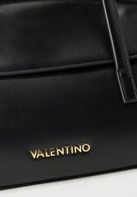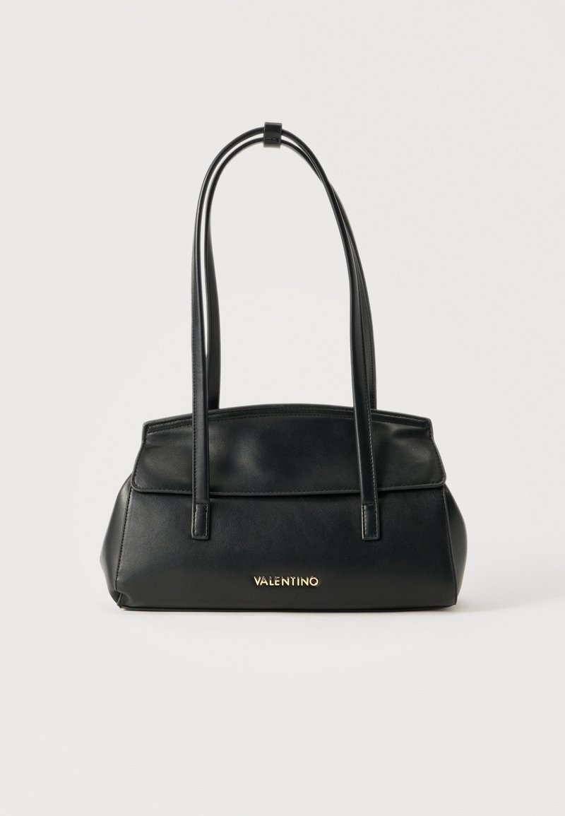 Μαύρη δερμάτινη τσάντα ώμου Valentino με δύο μακριά λουριά και χρυσό λογότυπο στο μπροστινό μέρος, πάνω σε λευκό φόντο.