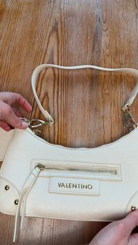 Κρεμ τσάντα ώμου Valentino με εξαρτήματα σε χρυσό χρώμα, μπροστινό τσεπάκι με φερμουάρ, γοητεία καθρέφτη σε σχήμα καρδιάς και αφαιρούμενο λουράκι.