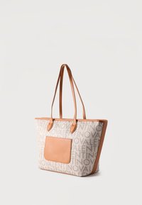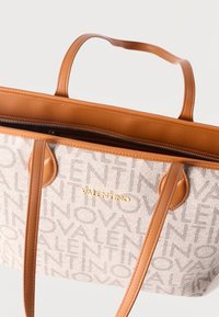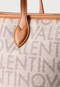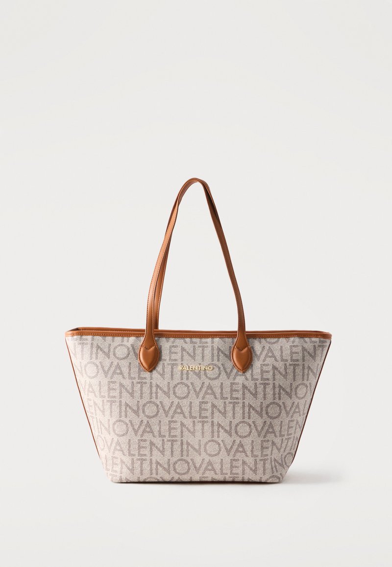 Τσάντα ώμου Valentino σε μπεζ με καφέ δερμάτινα χερούλια και διακοσμητικά, με επαναλαμβανόμενο μοτίβο λογότυπου Valentino και μικρό χρυσό όνομα της μάρκας στο μπροστινό μέρος.