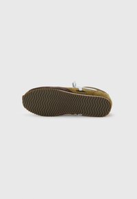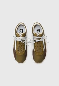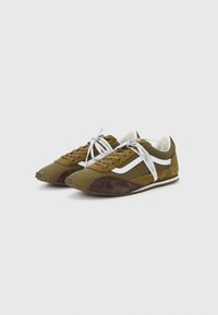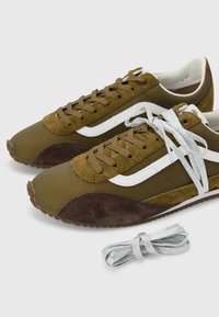 Αθλητικό παπούτσι από σουέντ σε ελιά και καφέ χρώμα με λευκή πλαϊνή λωρίδα και λευκά κορδόνια, απεικονισμένο από το πλευρό σε ανοιχτό γκρι φόντο.