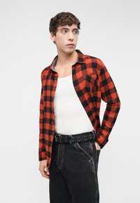 Άτομο που φοράει μαύρο τζιν παντελόνι με φαρδιά μπάρα, μαύρη ζώνη, κατακόκκινο και μαύρο καρό πουκάμισο, λευκή εσωτερική μπλούζα και μαύρα αθλητικά παπούτσια με λευκά κορδόνια.