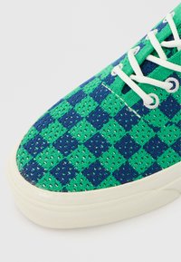 Κλασικό χαμηλό παπούτσι Vans με ύφασμα σε πράσινο και μπλε καρώ, λευκά κορδόνια και εκρού λαστιχένια σόλα, εμφανιζόμενο από τη πλευρά σε ανοιχτό φόντο.