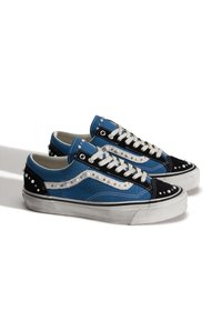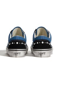 Μπλε και μαύρο sneaker χαμηλού προφίλ με λευκή σόλα, λευκά κορδόνια και διακοσμητικές λευκές πέρλες κατά μήκος της πλαϊνής ρίγας και της φτέρνας.
