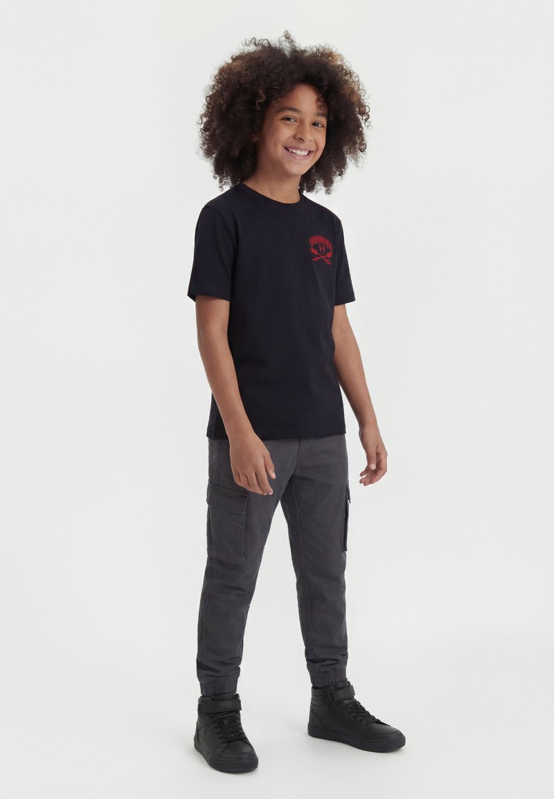 Χαμογελαστό παιδί με σγουρά μαλλιά, φορώντας μαύρο γραφικό μπλουζάκι, σκουρόχρωμο γκρι παντελόνι cargo και μαύρα ψηλά αθλητικά παπούτσια, στέκεται σε λευκό φόντο.