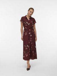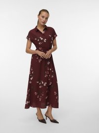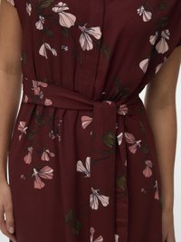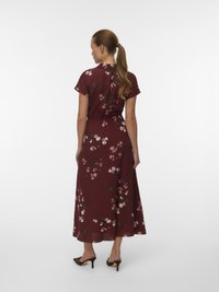 Γυναίκα που στέκεται φορώντας ένα μίντι φόρεμα μπορντό με κοντά μανίκια, γιακά, φλοράλ σχέδιο, ζώνη στη μέση και σκούρα μυτερά τακούνια.