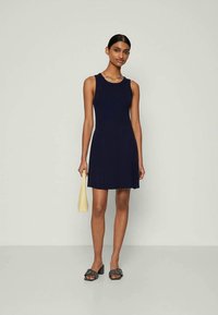 Ναυτικό μπλε χωρίς μανίκια φόρεμα με ριγέ υφή, στρογγυλή λαιμόκοψη και φαρδιά στρίφωμα. Φτιαγμένο από πλεκτό ύφασμα, σχεδιασμένο για εφαρμοστό σχήμα.
