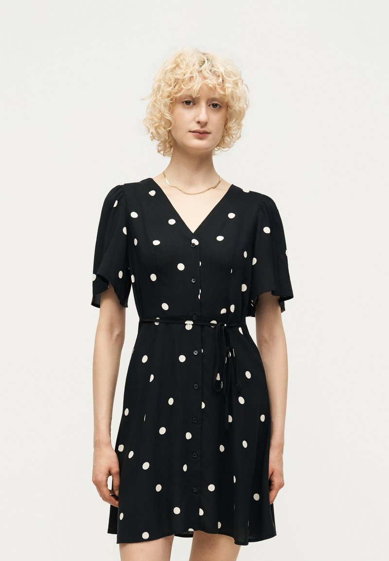 Γυναίκα με κοντά σγουρά ξανθά μαλλιά που φοράει μαύρο φόρεμα με κοντά μανίκια και λευκές πουά, με κουμπιά μπροστά και ζώνη στη μέση δεμένη.