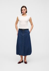 Νέα γυναίκα με κοντά σκούρα μαλλιά, που φοράει λευκή αμάνικη μπλούζα, κρίκους στα σκουλαρίκια, μαύρη ζώνη και μπλε τζιν φούστα, όρθια και κοιτάζοντας μπροστά.