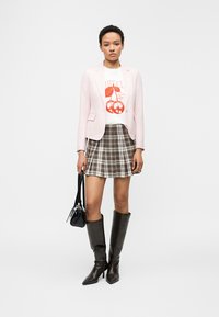 Γυναίκα που φοράει ένα ανοιχτό ροζ σακάκι, λευκό μπλουζάκι με γραφικό σχέδιο και καφέ καρό πλισέ φούστα, στέκεται μπροστά σε ένα απλό λευκό φόντο.