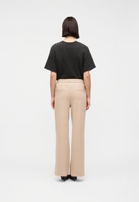 Μπεζ παντελόνι φαρδύ στο πόδι με μπροστινές ραφές, συνδυασμένο με μαύρες γόβες με μυτερή μύτη και μαύρο τοπ, σε μονόχρωμο φόντο.