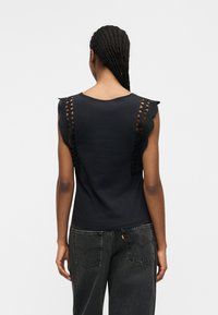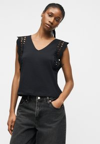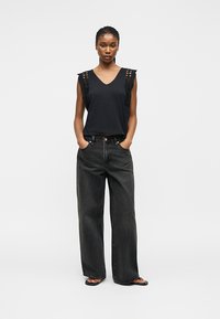 Νέα γυναίκα που φοράει μαύρο αμάνικο τοπ με λεπτομέρειες από κεντητό δαντέλα και ψηλόμεσα ξεβαμμένα μαύρα τζιν, στέκεται μπροστά σε ένα απλό φόντο.