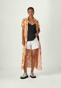 Μαύρη σατέν καμισόλα με V-λαιμόκοψη και λεπτές τιράντες, με χαλαρή εφαρμογή και ομαλή υφή. Συνδυάζεται με λευκά σορτς με φθορές.