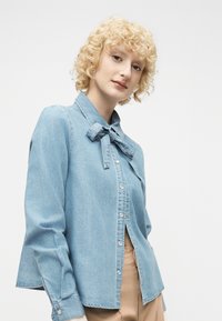 Γυναίκα που φοράει μπεζ παντελόνι ευθείας γραμμής, μπλε τζιν μπουφάν, λευκή μπλούζα με δαντελωτά μανίκια και σκούρα καφέ μπότες με τετράγωνη μύτη και τακούνι.