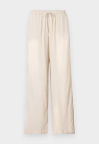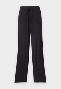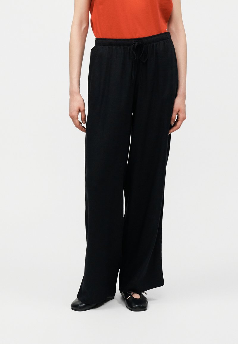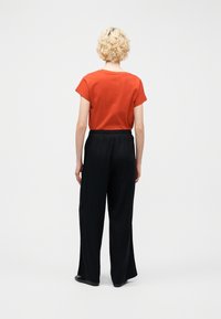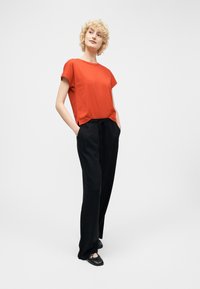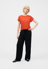 Άτομο με άνετο μαύρο παντελόνι με κορδόνι, πορτοκαλί αμάνικη μπλούζα και μαύρες μπαλαρίνες να στέκεται μπροστά σε απλό φόντο.