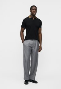 Άνδρας που φοράει μαύρο πόλο με κοντά μανίκια και γιακά με χρυσές λεπτομέρειες στα τελειώματα των γιακά και των μανικιών, σε συνδυασμό με ανοιχτό γκρι πλισέ παντελόνι.