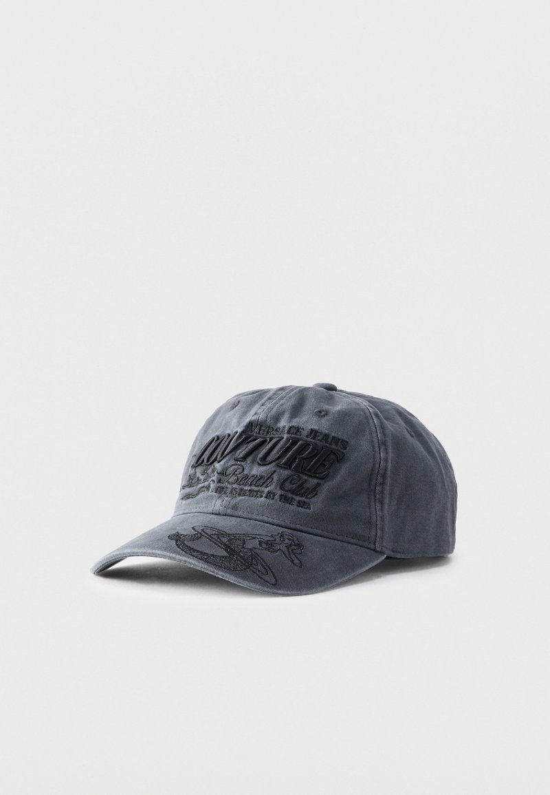 Σκούφος μπέιζμπολ σκούρου γκρι με κεντημένο μαύρο κείμενο "Couture" και διακοσμητικό σχέδιο στο μπροστινό μέρος και στον γείσο, πάνω σε απλό φωτεινό φόντο.