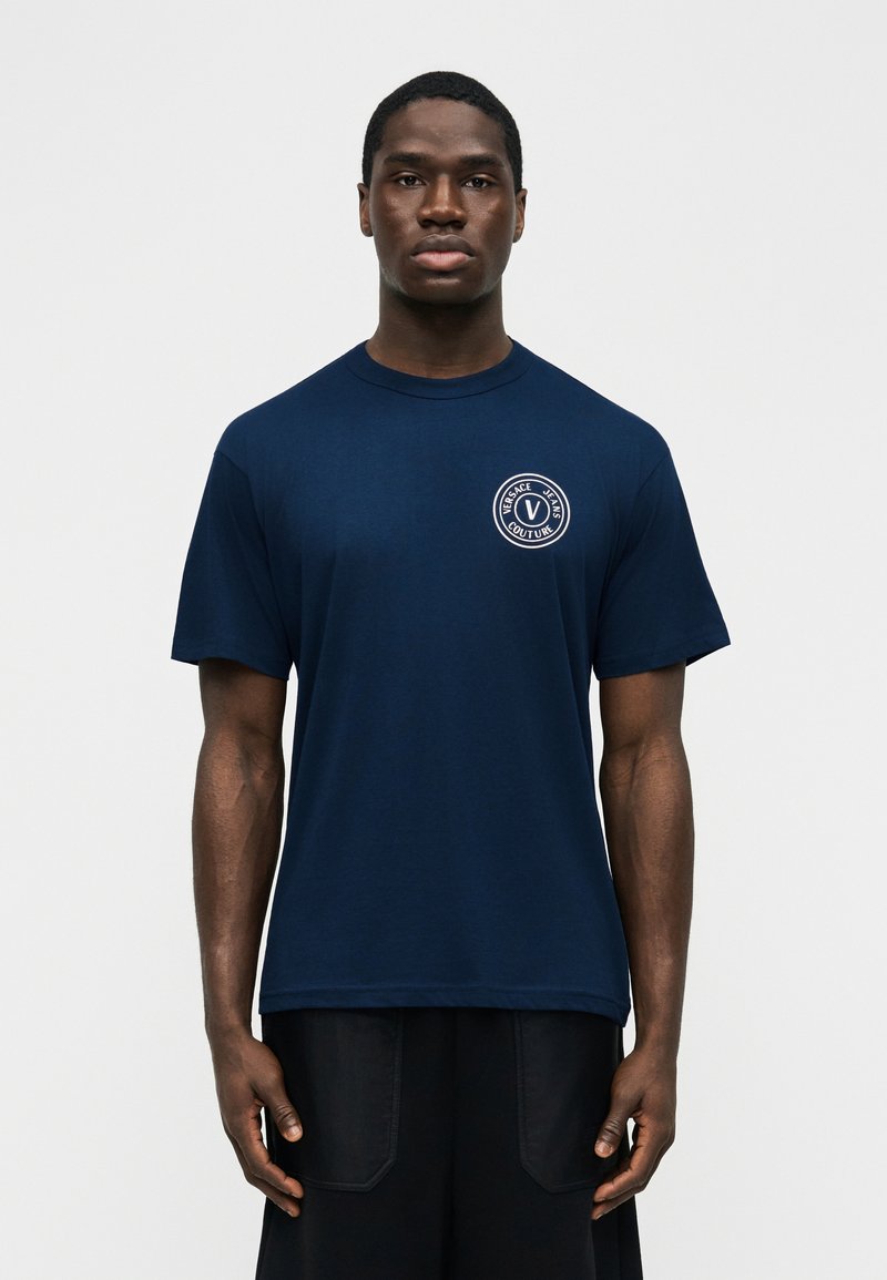 Άνδρας που φοράει μπλε σκουρόχρωμο μπλουζάκι Versace Jeans Couture με λευκό κυκλικό λογότυπο στο αριστερό στήθος, στέκεται μπροστά σε μονόχρωμο φόντο.