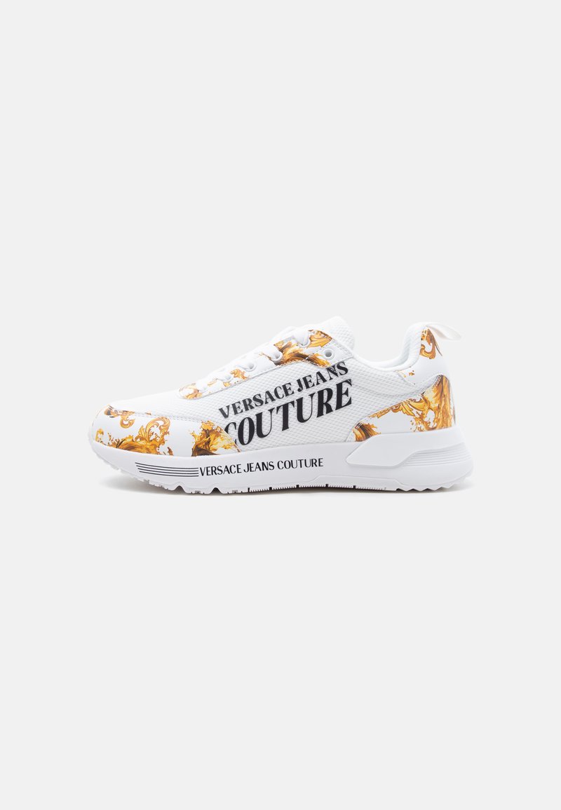 Άσπρο αθλητικό παπούτσι με χρυσό μπαρόκ σχέδιο, μεγάλο κείμενο "Versace Jeans Couture" στο πλάι και αντίστοιχο κείμενο στη σόλα, εμφανιζόμενο από το πλάι.