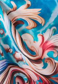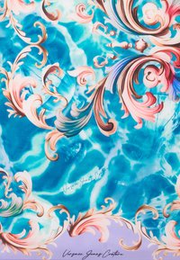 Τετράγωνο μαντήλι με μπλε μοτίβο νερού στο κέντρο και περίτεχνα ροζ, ροδακινί και χρυσά φυτικά σκαλίσματα σε λιλά περιθώριο.