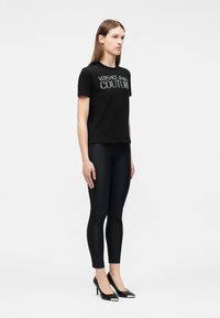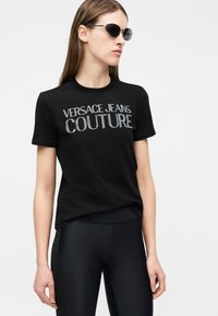 Γυναίκα που φοράει μαύρο μπλουζάκι με τη φράση «Versace Jeans Couture» από στράς και μαύρο εφαρμοστό παντελόνι, στέκεται μπροστά σε απλό λευκό φόντο.