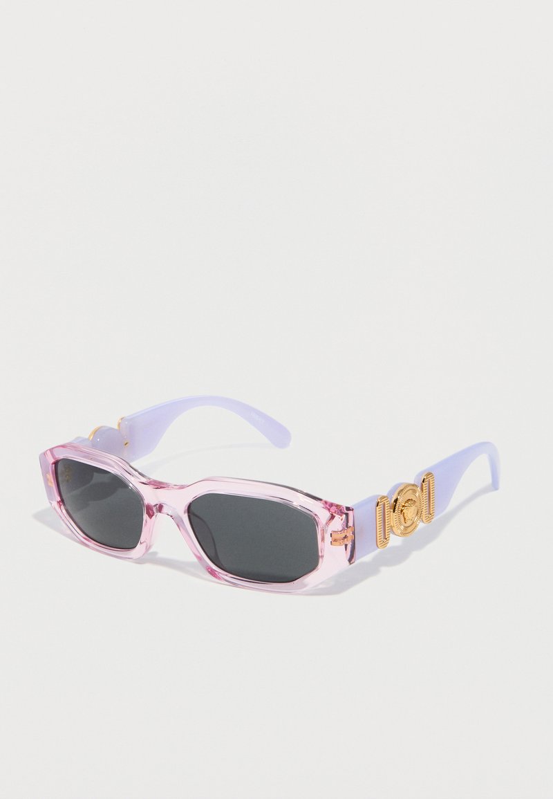 Ορθογώνια ροζ γυαλιά ηλίου με σκοτεινούς φακούς, λιλά βραχίονες και χρυσό έμβλημα Μέδουσας στις πλευρές.