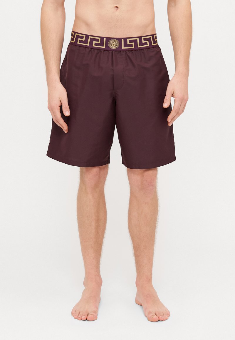 Μπορντό σορτς μαγιό με ελαστική μέση, διακοσμημένα με σχέδιο χρυσού ελληνικού κλειδιού. Φτιαγμένα από ελαφρύ, λείο ύφασμα.