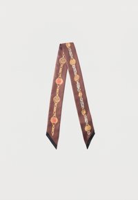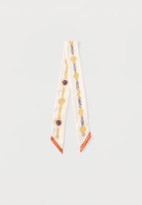 Μεταξωτό φουλάρι λαιμού με λευκή βάση, πορτοκαλί άκρα και σχέδιο με χρυσές και ασημένιες αλυσίδες και μετάλια, δεμένο σε χαλαρό κόμπο.