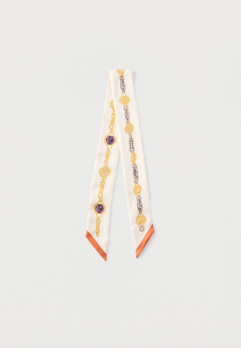 Εκρού μεταξωτό φουλάρι με σχέδια σε χρυσή αλυσίδα και μετάλλιο, με πορτοκαλί λεπτομέρειες στα άκρα και μυτερά άκρα.