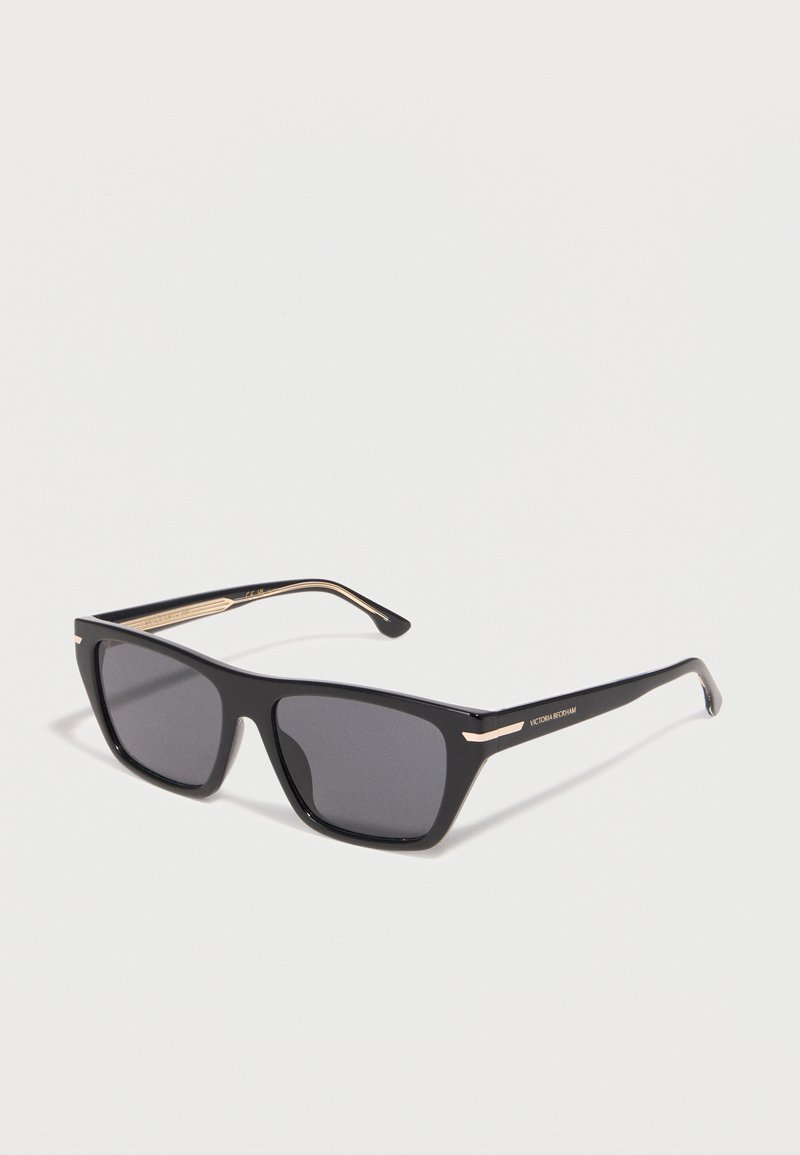 Μαύρα ορθογώνια γυαλιά ηλίου με σκούρους φακούς και χρυσές λεπτομέρειες, με το λογότυπο "Victoria Beckham" στο πλαϊνό σκελετό.