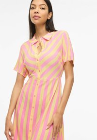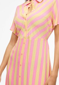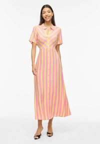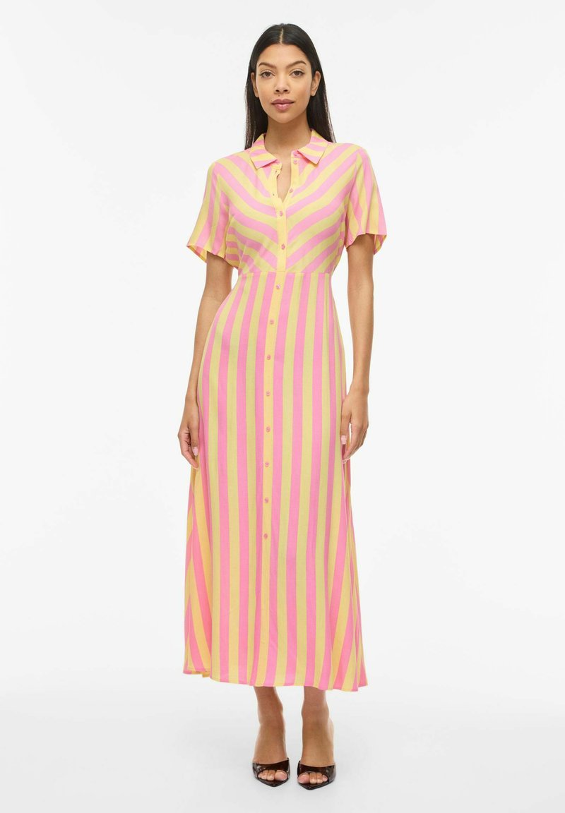 Γυναίκα που φοράει κίτρινο και ροζ κάθετα ριγέ midi φόρεμα με κουμπιά, κοντά μανίκια και μαύρες ανοιχτές γόβες.