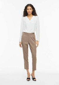 Λευκό μπλουζάκι με V λαιμόκοψη, μακριά μανίκια, υφή στο ύφασμα και άνετη εφαρμογή, συνδυασμένο με καφέ ψηλόμεσο παντελόνι με πλαϊνές τσέπες.