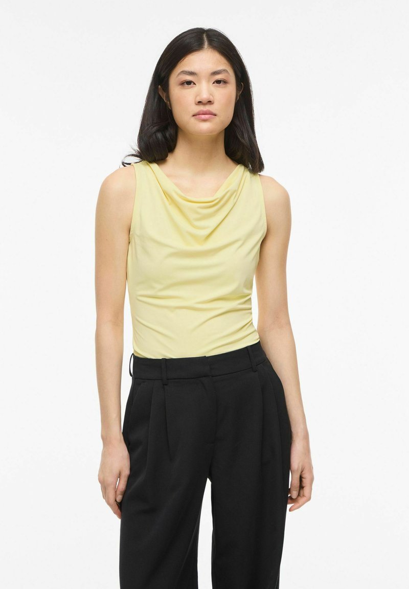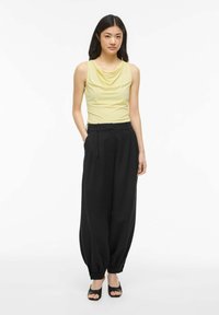 Γυναίκα με ίσια μαύρα μαλλιά που φοράει αμάνικη ανοικτόκίτρινη τοπ με draping και ψηλόμεσο μαύρο πλισέ παντελόνι, στέκεται μπροστά σε λευκό φόντο.