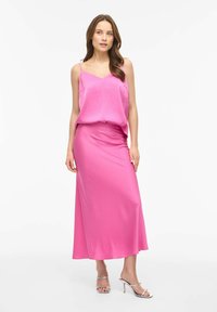 Γυναίκα με μακριά καστανά μαλλιά, φορώντας ένα αμάνικο φωτεινό ροζ σατέν τοπ και φούστα που ταιριάζει, στέκεται μπροστά σε έναν απλό λευκό φόντο.