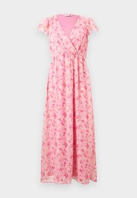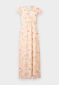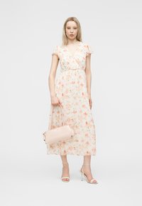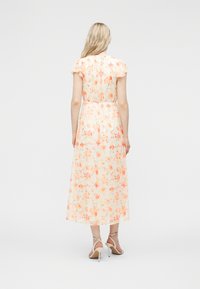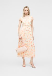 Γυναίκα που στέκεται με ένα ανοιχτό ροδακινί φόρεμα μέσης μήκους με φλοράλ σχέδιο, μανίκια που κυματίζουν και τακούνια με λουράκι στον αστράγαλο, μπροστά σε μια απλή γκρι επιφάνεια.