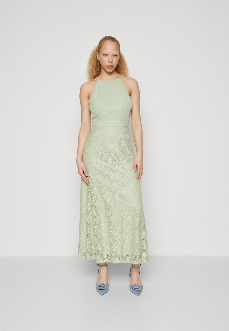 Ανοιχτό πράσινο μάξι φόρεμα δαντέλας με εφαρμοστό μπούστο, λαιμό σε σχήμα halter και πολύπλοκο ανθισμένο σχέδιο; σε συνδυασμό με ανοιχτό μπλε τακούνια.