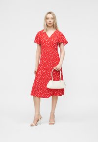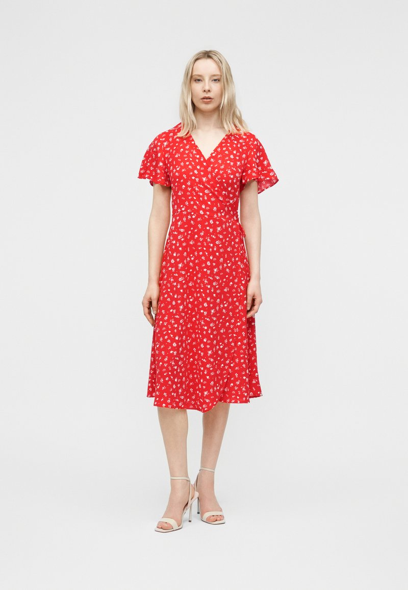 Ξανθιά γυναίκα που φοράει κόκκινο φόρεμα μέχρι το γόνατο με λευκά ανθισμένα σχέδια και φαρδιά μανίκια, σε συνδυασμό με λευκά ψηλοτάκουνα σανδάλια.