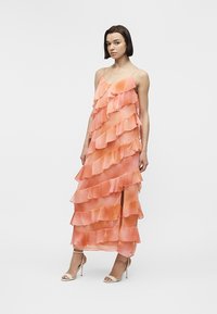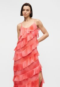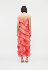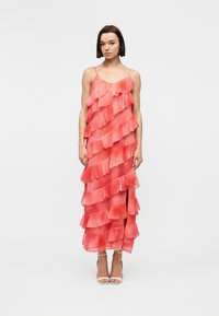 Γυναίκα που φοράει αμάνικο κοραλλί ροζ φόρεμα με στρωματοποιημένες βολάν και πλευρική σχισμή, συνδυασμένο με λευκά σανδάλια με ψηλό τακούνι.