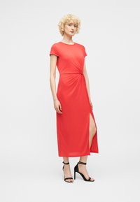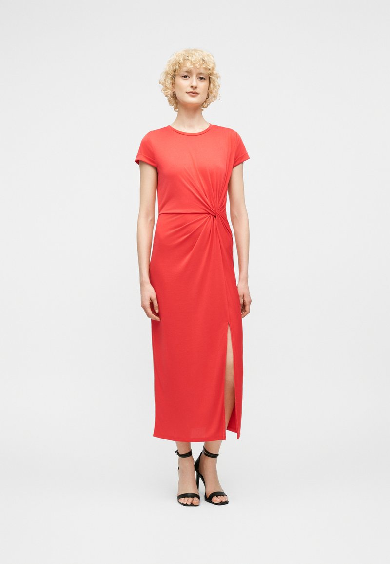 Γυναίκα με κοντά σγουρά ξανθά μαλλιά που φοράει κοραλλί μεσαίο φόρεμα με πλαϊνή σχισμή και μαύρα ψηλοτάκουνα σανδάλια, στέκεται μπροστά σε απλό φόντο.