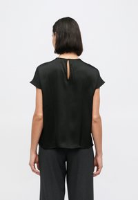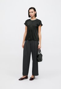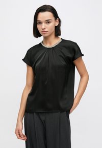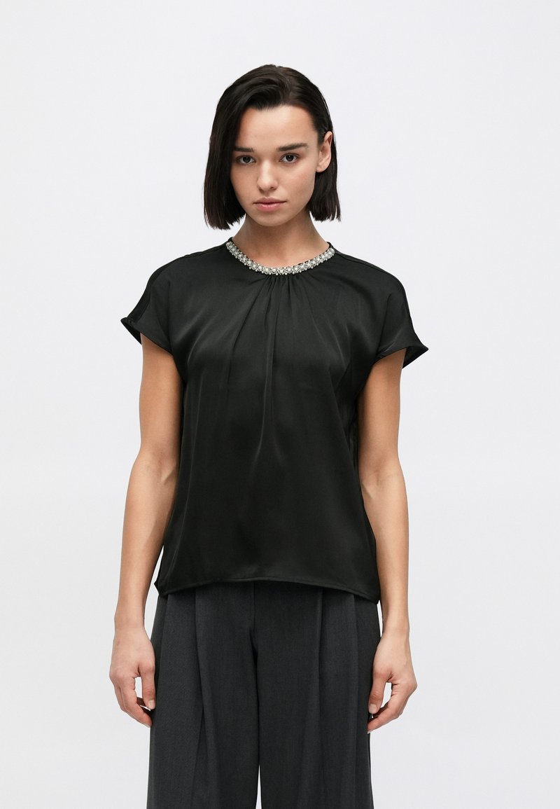 Μαύρο σατέν μπλούζα με πλισέ εμπρός και μανίκια καπέλο, διακοσμημένη με λαιμόκοψη με χάντρες. Συνδυασμένη με γκρι παντελόνι φαρδύ στο πόδι.