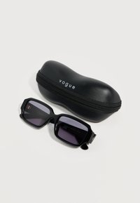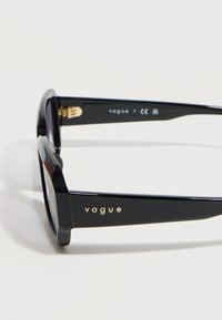 Μαύρα ορθογώνια γυαλιά ηλίου με σκούρα φακούς και τη λέξη «vogue» τυπωμένη σε χρυσό στο πλευρικό μέρος, τοποθετημένα σε λευκό φόντο.
