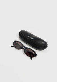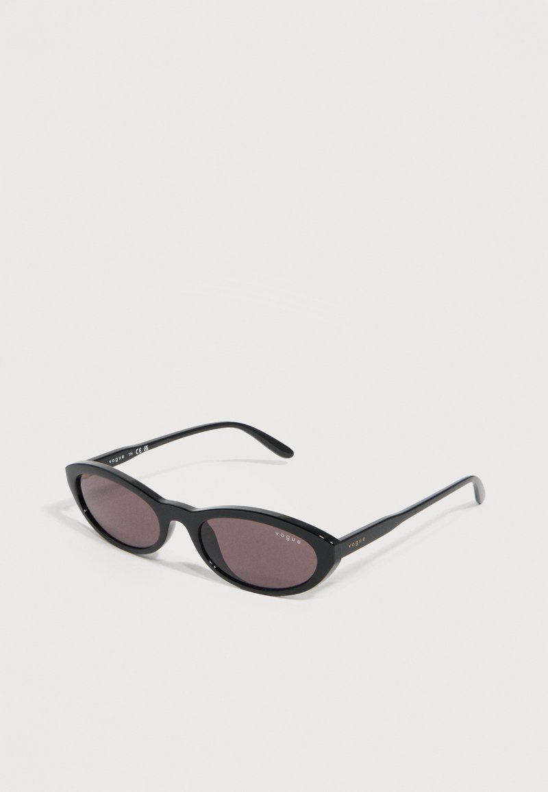 Γυαλιά ηλίου μαύρα σε στυλ cat-eye με σκοτεινούς φακούς και την επωνυμία «Vogue» στον φακό και στα πλαϊνά, με λευκό φόντο.