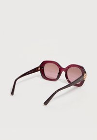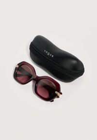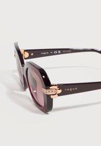 Σκούρα κόκκινα τετράγωνα γυαλιά ηλίου με υπερμεγέθη σκελετό, φακούς με βαθμιαία σκίαση και χρυσές διακοσμητικές λεπτομέρειες στα πλαινά, με εμφανές το λογότυπο της μάρκας "Vogue".