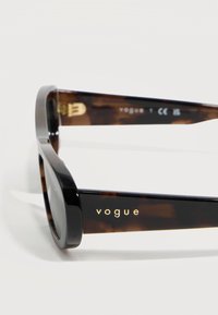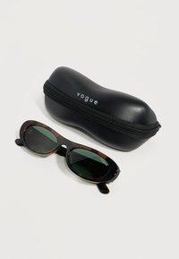 Γυαλιά ηλίου οβάλ σκελετού σε σχέδιο χελώνας με φακούς σκούρου πράσινου χρώματος και το λογότυπο "vogue" στα πλευρά, τοποθετημένα πάνω σε απλό ανοιχτόχρωμο φόντο.